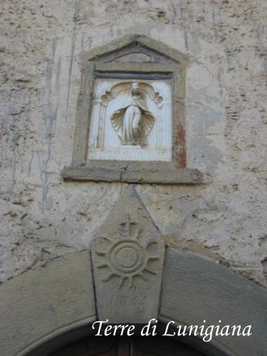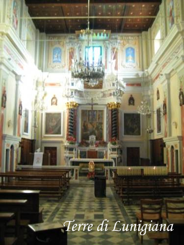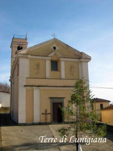 La chiesa presenta una facciata regolare a capanna racchiusa da due paraste angolari, con timpano triangolare aperto, finestra centrale appoggiata alla cuspide corrispondente alla sottostante finestra e semplice portale in arenaria. L'interno è ad aula unica, di stampo settecentesco, ridipinto nel 1967 dal pittore Triani di Pontremoli, conserva una grande tela raffigurante San Michele e Nostra Signora della Neve. L'imponente campanile è a base quadrata.